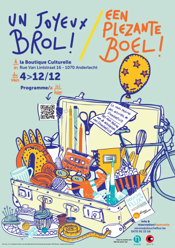 Sinds haar oprichting biedt DoucheFLUX niet alleen douches aan voor thuisloze personen. Er wordt ook altijd een breed aanbod aan culturele, creatieve, sportieve en expressieve activiteiten georganiseerd. Activiteiten om het dagelijkse leven even op pauze te zetten, om nieuwe vaardigheden te leren, om lichaam of geest in beweging te brengen, om een fijne tijd te delen met anderen… Of het nu wekelijks is of af en toe! Via deze tentoonstelling en dit mini-festival kan je je volledig onderdompelen in de activiteiten van DoucheFLUX en meer te weten komen over wat er daar elke dag gebeurt.